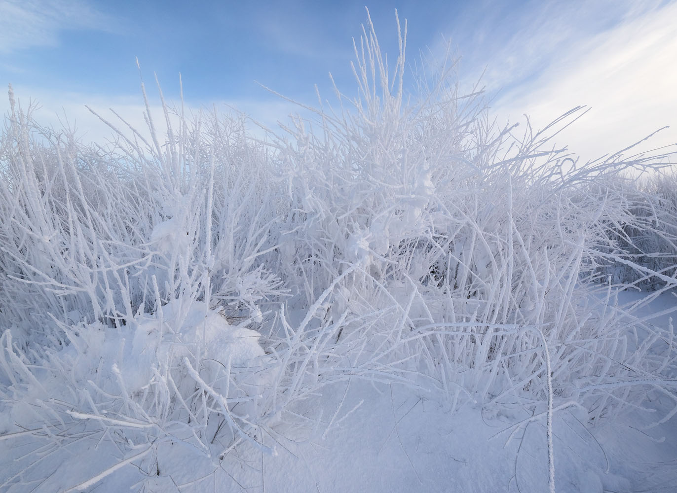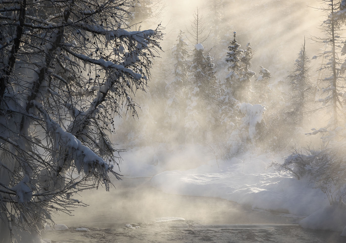 Our drive brings us to the second shooting location: Jargant River. This magical place offers something very few other do: a flowing, liquid river even when it's -35 degrees outside, made possible by the underground source of the water. The intense temperature difference between the water and the air causes heavy condentation, which in turns sticks to the adgacent trees and absolutely cakes them with ice. Needless to say, this is an extremely beautiful phenomenon, and we will spend a lot of time perfecting out shots of it.