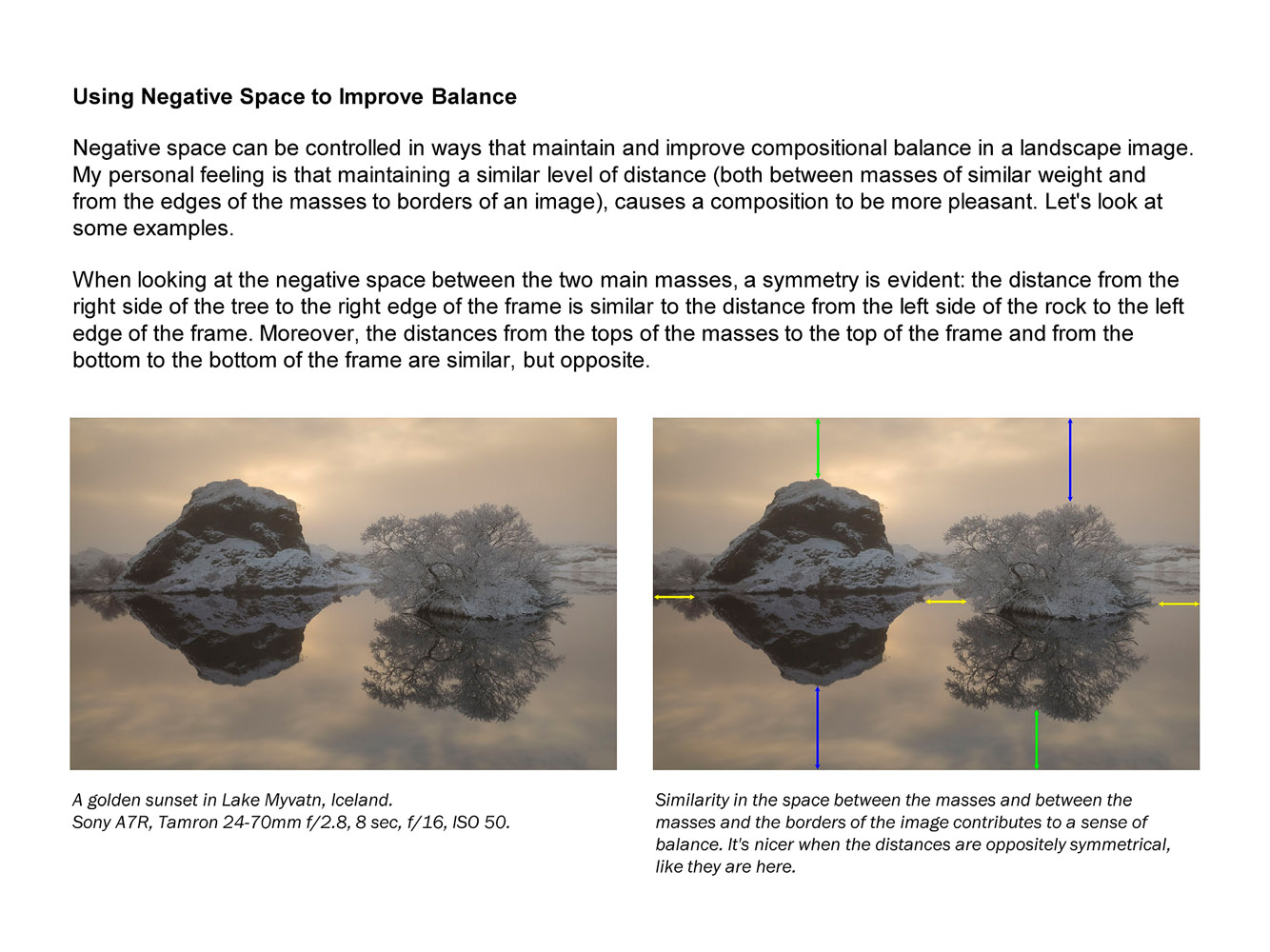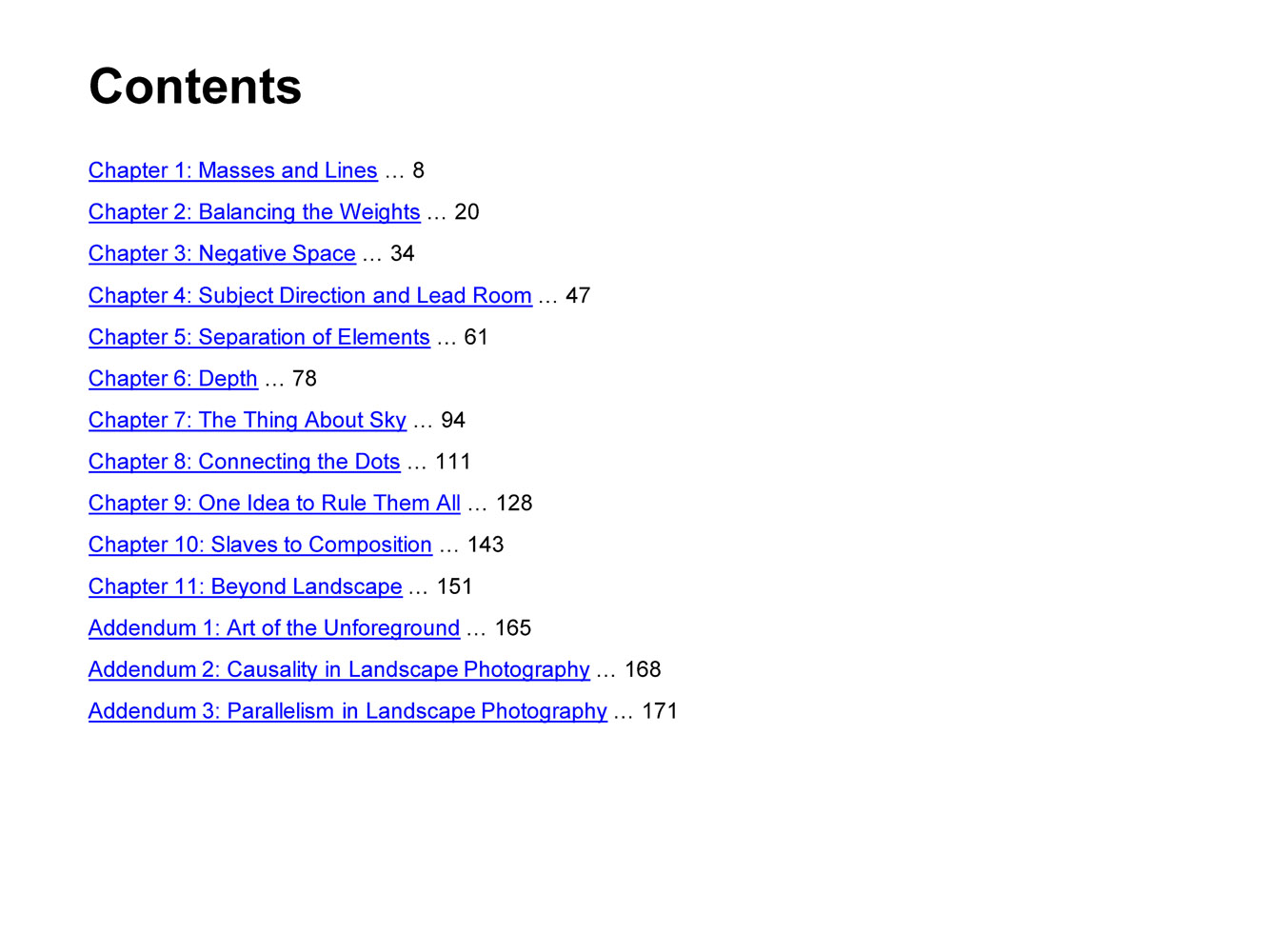 When it comes to landscape photography, composition reigns supreme as the single most important thing determining the appeal of a shot. It’s not easy transferring intuitive understanding to concrete ideas, but I think it’s possible to break down most of the considerations one should keep in mind when trying to compose a landscape shot. In this 173-page book, I will try to describe them in the clearest way possible, using many examples and simple explanations. I view composition as a mental puzzle to be solved by the photographer, and in order to teach you how to solve it, I will apply a gradual progression of arguments and ideas. I will begin by getting you to understand how I see compositional elements, and then explain how to treat and use these elements to create a good composition, step by step. Each chapter will build on the previous ones and further advance the reader’s ability to solve the visual puzzle of nature.